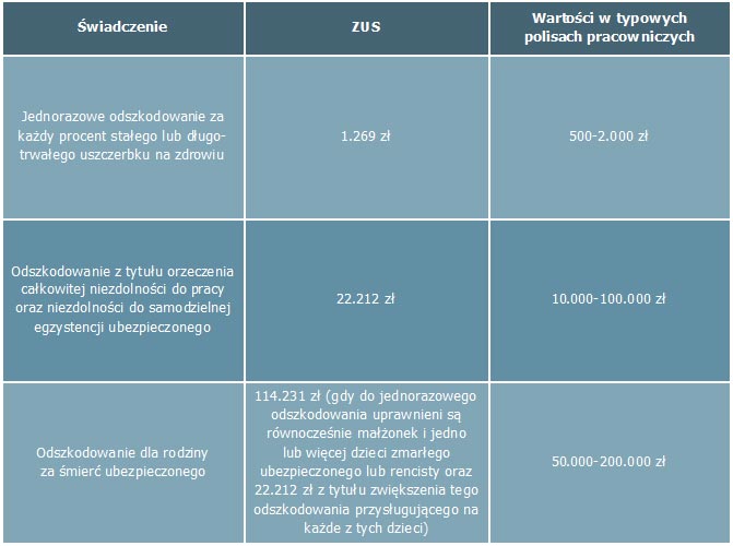 Odszkodowanie za wypadek z ZUS nie wyklucza wypłaty z polisy pracowniczej i odwrotnie. Warto też pamiętać, że grupowe ubezpieczenia pracownicze są łatwiej dostępne i tańsze w porównaniu z indywidualnymi polisami zdrowotnymi i na życie.