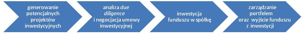 A. Fundusz typuje spółki, które mogą być przedmiotem inwestycji. Są to zarówno projekty wyszukane przez fundusz, jak i zgłoszone przez samych przedsiębiorców. Następnie lista potencjalnych projektów inwestycyjnych jest zawężana do „kwalifikowanych projektów inwestycyjnych”, natomiast wytypowane spółki będą przedmiotem dalszego szczegółowego badania (tzw. due diligence). W tej fazie fundusz uzgadnia z wybranymi spółkami wstępny plan dalszych działań oraz podstawowe warunki podstawowe warunki transakcji (tzw. termsheet).