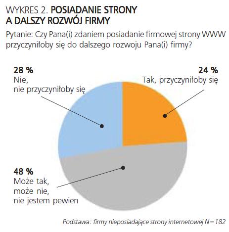 Na samodzielne przygotowanie strony internetowej zdecydowałoby się 36 proc. firm, blisko dwie trzecie (64 proc.) odrzuca taką ewentualność, argumentując to brakiem umiejętności. Dodatkowo, polscy przedsiębiorcy nie wykorzystują możliwości jakie daje posiadanie strony internetowej. Tyko 12 proc. prowadzi sklep internetowy, 14 proc. używa forum, a 15 proc. korzysta z opcji video i innych multimediów. Większość firm posiada natomiast na swojej stronie dane kontaktowe (98 proc.), prezentuje za jej pośrednictwem ofertę (92 proc.) i galerię zdjęć (80 proc.).