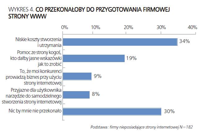 Co ciekawe jednak, zapytani co skłoniłoby ich do przygotowania strony internetowej, przedsiębiorcy w większości odpowiadali – niskie koszty (34 proc.), pomoc ze strony kogoś, kto dałby jasne wskazówki (19 proc.) oraz przyjazne dla użytkownika narzędzie do samodzielnego stworzenia strony internetowej (8 proc.) (wykres nr 4).