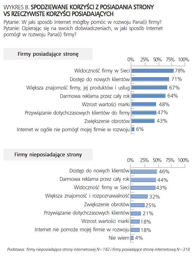 Bardziej sceptyczni, jeśli chodzi o korzyści płynące z obecności w Internecie, są przedsiębiorcy, którzy nie mają strony internetowej. Jedynie 1/4 z nich uważa, że posiadanie WWW przyczyniłoby sie do rozwoju ich biznesu. Dla blisko połowy (46 proc.) posiadanie strony internetowej wiąże się z dostępem do nowych klientów, darmową reklamą (44 proc.) i zwiększeniem widoczności firmy w sieci (43 proc.) (wykres nr 8).