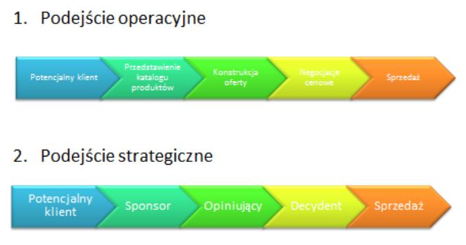 Uschematyzowany proces sprzedaży, zdefiniowane w systemie procedury i kroki zapewnią pracownikowi jasny obraz jego zadań i celów na poszczególnych etapach pracy. Systemy CRM umożliwiają zamodelowanie wielu różnych typów procesów sprzedaży od sprzedaży powtarzalnej, przez konstruowanie produktu pod zamówienie, po procesy typu win-back, czy obsługę nowego klienta. Można zdefiniować inną procedurę i stosować ją do obsługi klienta strategicznego, utrzymaniowego czy wobec klienta, który jest na etapie utraty. Dane potrafią automatycznie przypisać nową fazę po spełnieniu warunków koniecznych, zadbają o to aby przekazać przełożonemu do zatwierdzenia ofertę po przekroczeniu określonego wolumenu. Dla organizacji kluczowe jest opisanie modelu w oparciu, o który chce definiować przejście do kolejnych faz sprzedaży tak, aby kontrolować status procesu. Pracownik działający w określonych obszarach, obsługujący konkretny segment klientów ma dokładnie wyznaczane zadania, prostą ścieżkę ich realizacji i w oparciu o zdefiniowane cele nie gubi się w procesie przekazując tym samym spójne i porównywalne dane w całej organizacji. Możemy wyodrębnić podejście operacyjne lub strategiczne.