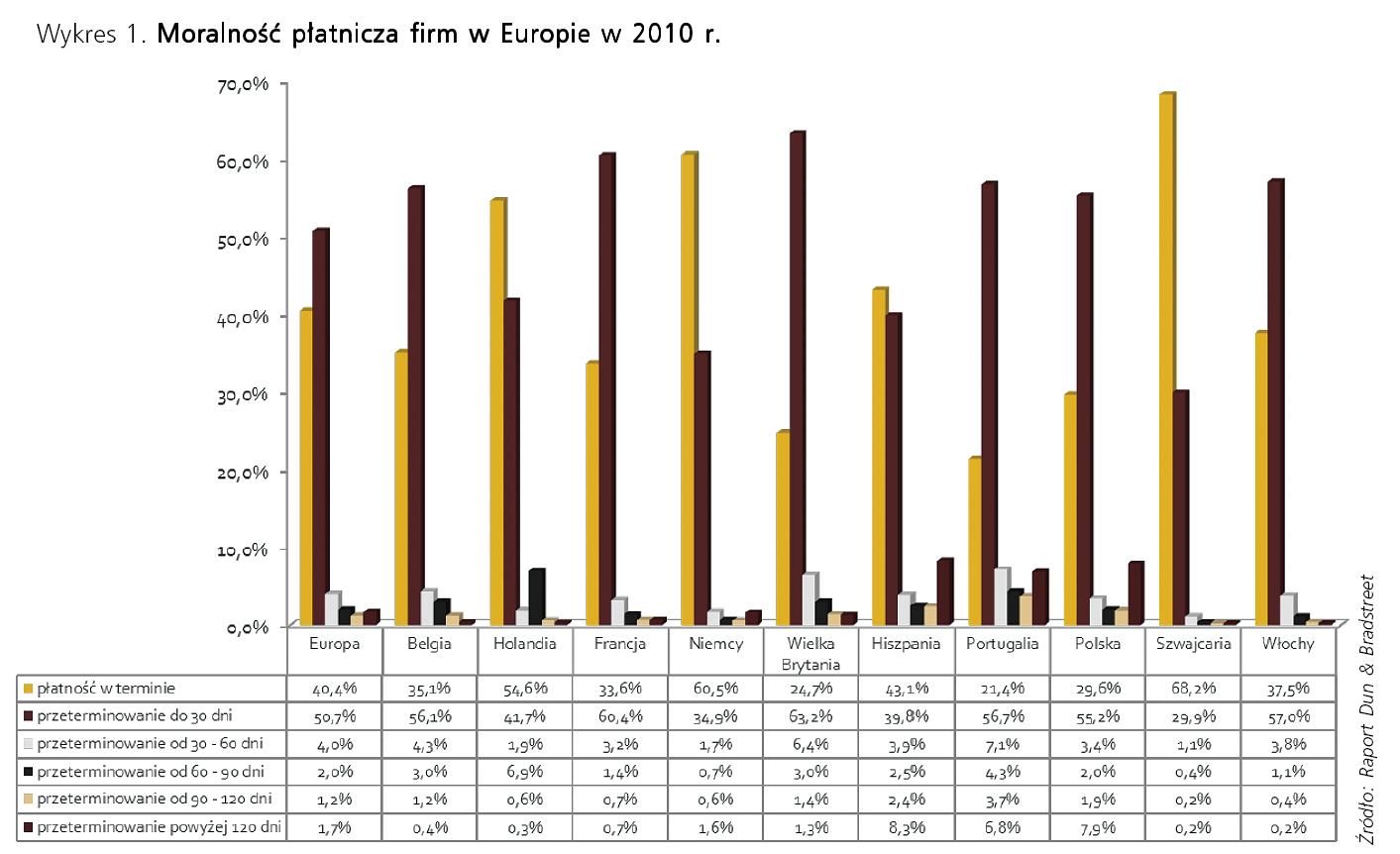 Ogółem w Polsce w 2010 r. zaledwie co trzecia faktura opłacona była w terminie. Na przestrzeni ostatnich trzech lat moralność płatnicza w naszym kraju spadła o ponad 17 proc. Tym samym zaledwie 55 proc. należności opłacanych jest w uzgodnionym terminie. Dodatkowo, blisko 8 proc. należności regulowanych jest po 120 dniach. Tak wysoki odsetek plasuje nasz kraj w ogonie Europy. Dane statystyczne pokazują, że w naszym kraju firmy (niezależnie od wielkości) w jednakowym stopniu opóźniają swoje zobowiązania finansowe.