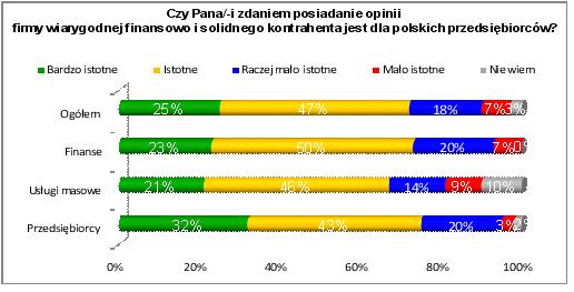 Z raportu BIG, publikowanego przez BIG InfoMonitor, wynika, że blisko trzy czwarte badanych firm deklaruje, że w ich branży opinia firmy wiarygodnej finansowo ma duże znaczenie dla prowadzenia działalności gospodarczej. Co czwarty respondent (25 proc.) jest zdania, że to bardzo istotna kwestia dla jego interesów. Blisko połowa (47 proc.) przedsiębiorców twierdzi, że dla polskich firm posiadanie pozytywnej opinii – firmy wiarygodnej finansowo jest istotne. Tylko 7 proc. zgłasza, że nie ma to dużego znaczenia.
