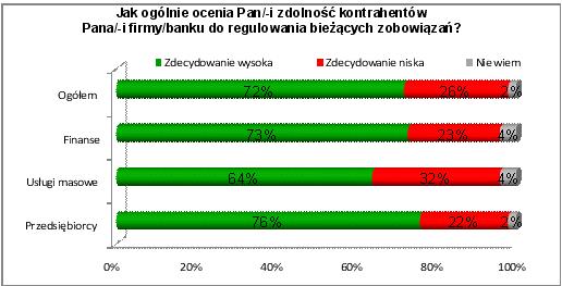 Aż 76 proc. wszystkich badanych firm uważa, że nieterminowe regulowanie płatności stanowi poważną przeszkodę w prowadzeniu działalności gospodarczej w Polsce i taka opinia utrzymuje się od dawna wśród przedsiębiorców. W największym stopniu nieterminowe płatności stanowią przeszkodę dla branży usług finansowych – 79 proc. przedstawicieli tego sektora podziela to zdanie. Podstawowym przymiotem firmy wiarygodnej finansowo jest terminowe regulowanie płatności i to nie tylko wobec kluczowych kontrahentów, od których zależy nasz biznes, ale także wobec Urzędu Skarbowego, ZUS-u, podwykonawców, wynajmujących lokale użytkowe, a także terminowe płacenie pensji pracownikom.