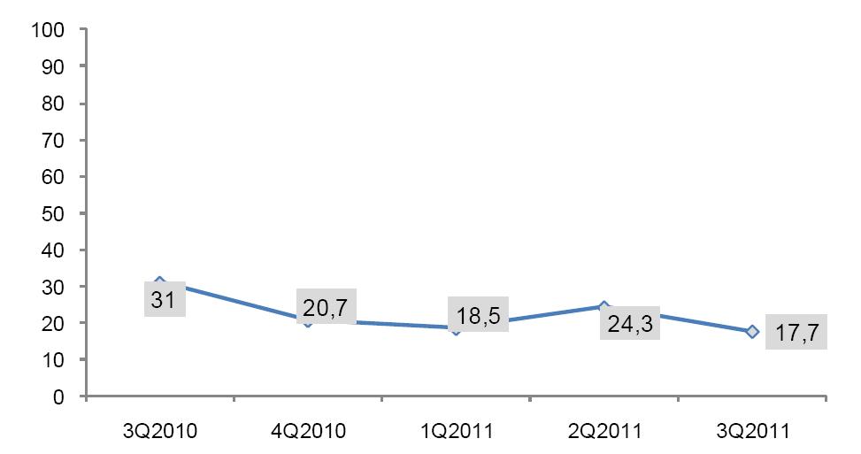 Analizując plany inwestycyjne dla poszczególnych obszarów w ujęciu historycznym otrzymujemy porównanie, jak znacząco spadek nastrojów przekłada się na degresję planów zakupowych. Szczególnie zauważalne cięcia dotyczą obszaru kompetencji, tj. zakupów nieobowiązkowych szkoleń dla pracowników, który z 33,6 proc. na początku roku zniżył się do 16 proc. Za spadki odpowiedzialny jest nie tylko sezon urlopowy, ile redukcja nakładów na szkolenia dotowane w ramach programu unijnego EFS, których pik przypadł na lata 2009-2010. Przedsiębiorcy niechętnie inwestują w szkolenia także wówczas, gdy koszt w całości ma obciążać firmę. W trzecim kwartale uzyskujemy równocześnie mocny spadek wydatków na marketing i reklamę. Choć relatywnie – na tle innych obszarów – marketing wypada dobrze (18,2 proc. będzie inwestować), to spadek r/r jest 100-procentowy, a Q/Q 18,6-proc. Jak wiadomo, w małych firmach, jak i w dużych przedsiębiorstwach pogorszenie sytuacji w pierwszym kroku oznacza cięcia wydatków na reklamę. W związku z tym ewentualne utrzymanie trendu spadkowego w tym obszarze w czwartym kwartale będzie zapowiedzią negatywnych działań w kolejnych obszarach, w tym najbardziej bolesnym, czyli zmniejszaniu zatrudnienia.