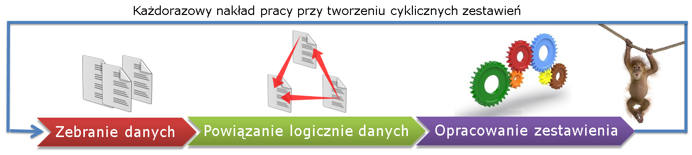 Powszechny scenariusz: Zapewne Pan Jaś przygotował sobie szablon raportu w Excel’u. Co miesiąc wkleja w odpowiednie komórki nowe, aktualne dane. Może się okazać, że danych jest więcej niż przewidział, zatem poświęca czas na dodanie nowych wierszy, na ich sformatowanie, modyfikowanie formuł, które liczą podsumowania, modyfikowanie układu wydruku. Krótko mówiąc – to monotonna praca, która prowadzi do znużenia, pomyłek i niezadowolenia z pracy.