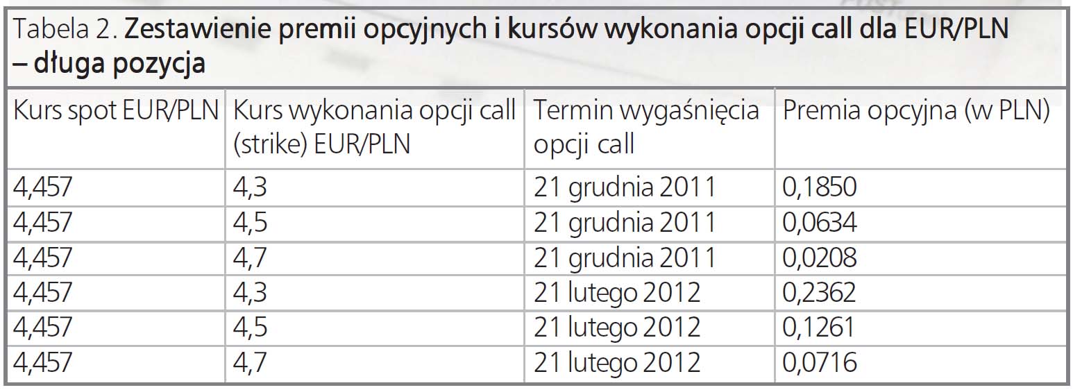 Załóżmy, że chcemy kupić sobie prawo do kupna EUR/PLN w dniu 21 grudnia po kursie nie wyższym niż 4,30. Za takie prawo płacimy dzisiaj premię opcyjną w wysokości 0,1850 zł za jednostkę waluty (czyli jeżeli chcielibyśmy zabezpieczyć kupno 100 000 euro za złote musielibyśmy za to prawo zapłacić 18 300 zł). Jeżeli w dniu wygaśnięcia opcji kurs na rynku będzie niższy niż 4,30, wówczas nie skorzystamy z prawa, jakie daje opcja, tylko kupimy walutę na rynku. Jedynym poniesionym przez nas kosztem będzie premia.