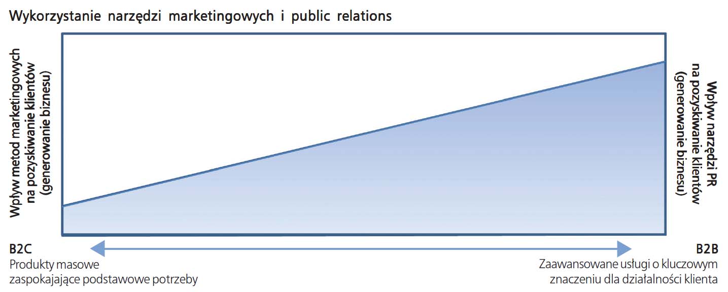 Dla firmy z sektora B2C narzędzia marketingowe mają zatem kluczowe znaczenie, gdyż zapewniają bezpośrednie dotarcie z ofertą do szerokiego grona klientów. Rola PR-u jest ważna, lecz pełni rolę uzupełniającą marketing, wspiera go.