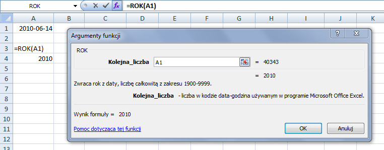 Rok Argument rok może zawierać od jednej do czterech cyfr. Program Microsoft Excel interpretuje argument rok zgodnie z używanym systemem daty.
