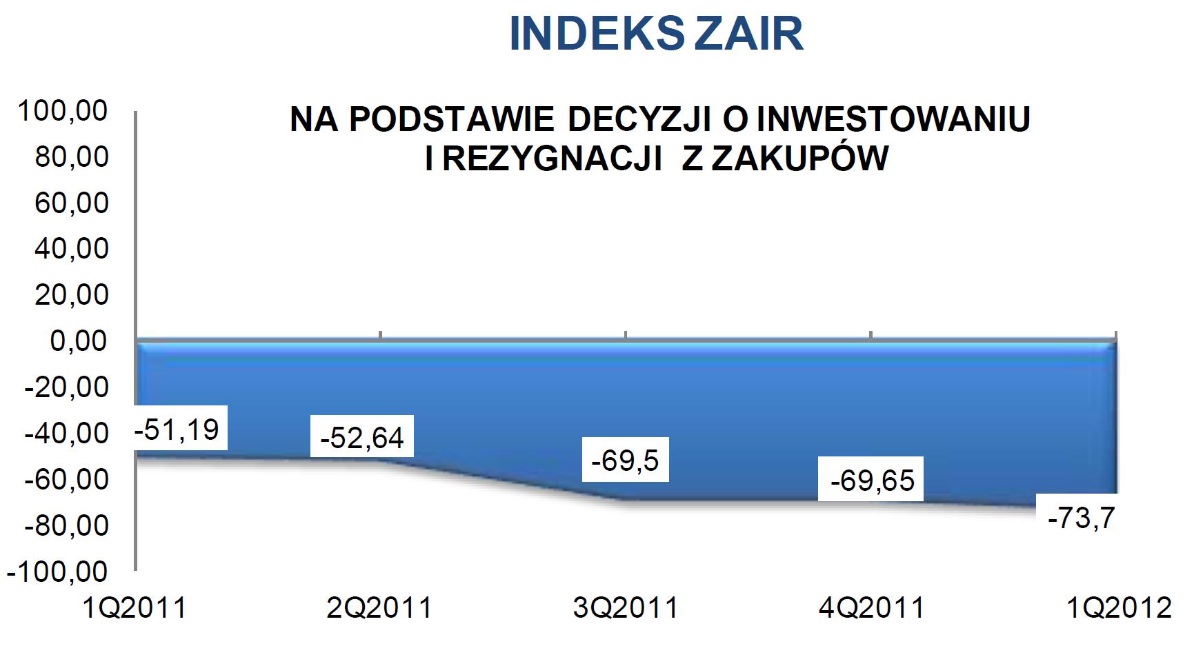 Index ZAIR, informujący o skali zakupów (klimacie inwestycyjnym w MSP), oparty jest na informacjach o tym, czy zdecydowano o konkretnych wydatkach na dany kwartał czy nie. W tej edycji badania INDEX ZAIR wyniósł -73,7 pkt, co daje spadek o 4,04 pkt kw/kw. Oznacza to, że firmy, które zdecydowały się inwestować, będą inwestować dużo skromniej, niż w poprzednim kwartale i zdecydowanie skromniej, niż rok temu w analogicznym czasie.