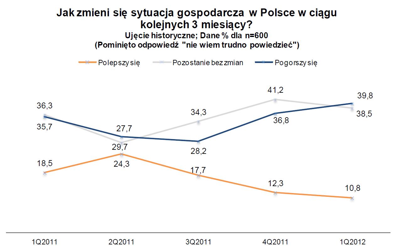 Jak wynika z badania, MSP najwyraźniej nie spodziewa się gwałtownych zmian w gospodarce, ale utrzymuje się trend wysokiego poziomu niepokoju o przyszłość gospodarczą Polski. Aktualnie pogorszenia w gospodarce spodziewa się 39,8 proc. badanych – w poprzednim kwartale stanowili oni 36,8 proc. Równocześnie prawie tyle samo, ilu pesymistów, jest przedsiębiorców oceniających, że sytuacja ekonomiczna Polski pozostanie bez zmian – 38,5 proc. O ile poziom negatywnych ocen jest zbliżony do tego, który notowano rok temu w analogicznym czasie, o tyle wówczas odsetek prognozujących pozytywnie wynosił ponad 18 proc. Tymczasem obecnie radykalnie skurczyła się liczba optymistów. Dziś stanowią jedynie 10,8 proc. badanych. To kolejny rekordowy wynik, bo najniższy, jak dotąd notowany, jeśli wziąć pod uwagę udział firm wróżących pozytywnie dalszemu rozwojowi sytuacji w krajowej gospodarce.