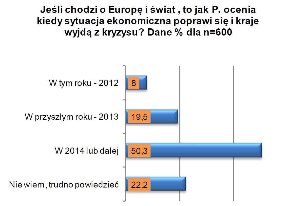 Przedsiębiorcy nie mają natomiast nadziei na szybką poprawę sytuacji ekonomicznej Europy i świata. Połowa badanych uważa, że dopiero w 2014 r. lub dalej można się spodziewać lepszej kondycji ekonomicznej gospodarek. Wyjścia z kryzysu w tym roku spodziewa się jedynie 8 proc. badanych, a na przyszły rok, jako możliwą datę zakończenia kryzysu, wskazuje 19,5 proc. przedsiębiorców. Spory odsetek badanych, bo 22,2 proc., nie kusi się nawet o prognozy – twierdzą, że trudno ocenić, kiedy światowe gospodarki „staną na nogi” i zażegnamy kryzys.