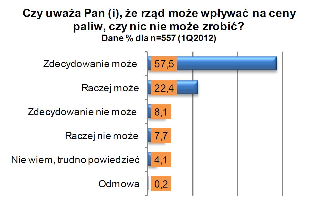 W sumie niemal 80 proc. przedsiębiorców uważa, że rząd ma (i może je stosować) instrumenty wpływające na to, jak kształtują się ceny paliw na stacjach benzynowych. Zdecydowanie pewnych tego jest 57,5 proc. badanych, z kolei 22,4 proc. uważa, że „rząd raczej może wpływać na poziom cen”.