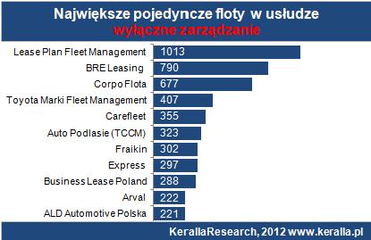 Z informacji Keralla Research wynika, że największe pojedyncze floty w kraju, obsługiwane dla jednego klienta w wariancie full service leasing, mieli w swoim portfelu w 2011 r. następujący oferenci: Transpost (1891 pojazdów), Toyota Marki (1226), Bankowy Fundusz Leasingowy (1070), Alphabet (975), BRE Leasing (907) oraz Corpo Flota (903).