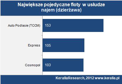 Największe floty w ciągle mało popularnym, choć zyskującym klientów najmie posiadały spółki: Auto Podlasie - 153, Express 105 pojaz-dów oraz Cosmopol 103 pojazdy.
