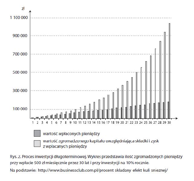 Procent składany sprawia, że nawet drobne oszczędności po latach mogą pomnożyć się w całkiem pokaźny kapitał. Gdybyś zaczął oszczędzać lub inwestować pieniądze już na początku swego życia (to oczywiście nierealne, ale zawsze mógłbyś liczyć na zapobiegliwych i myślących strategicznie rodziców, którzy odkładaliby pieniądze w twoim imieniu przez pierwszych kilkanaście lat), to po przejściu na emeryturę w wieku 65 lat, przy założeniu, że średni roczny zysk z inwestycji wyniósłby 7 proc. – czyli więcej niż na lokacie i w obligacjach, ale mniej, niż oferowała najbardziej długoterminowym inwestorom w swej dotychczasowej historii warszawska giełda – będziesz dysponował kapitałem w wysokości... prawie 2,5 mln zł!