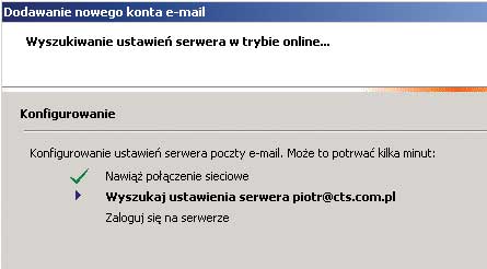 Po wprowadzeniu tych informacji Outlook spróbuje automatycznie odnaleźć serwer i połączyć się ze skrzynką pocztową: