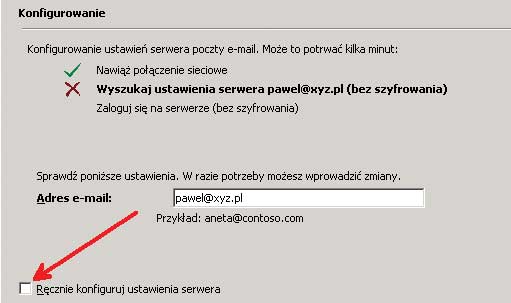 Jeśli automatyczna konfiguracja się nie powiedzie, należy zaznaczyć opcję Ręcznie konfiguruj ustawienia serwera i kliknąć przycisk dalej: