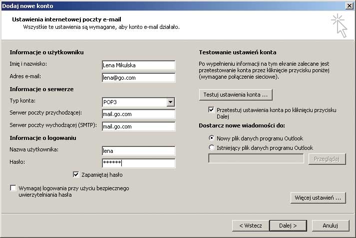 Po kliknięciu przycisku dalej należy uzupełnić dane dotyczące konta pocztowego: