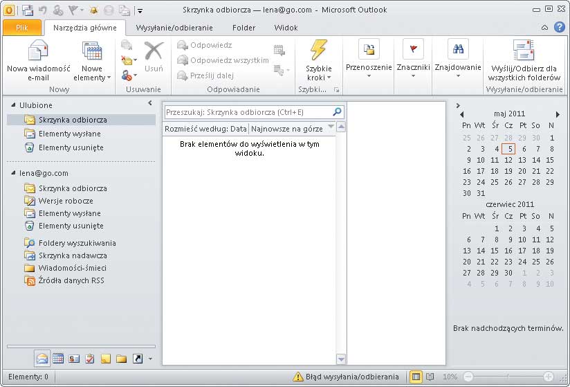 Jeśli Outlook uruchamiany jest po raz pierwszy, wówczas po skonfigurowaniu konta uruchomione zostanie główne okno programu które wygląda następująco: