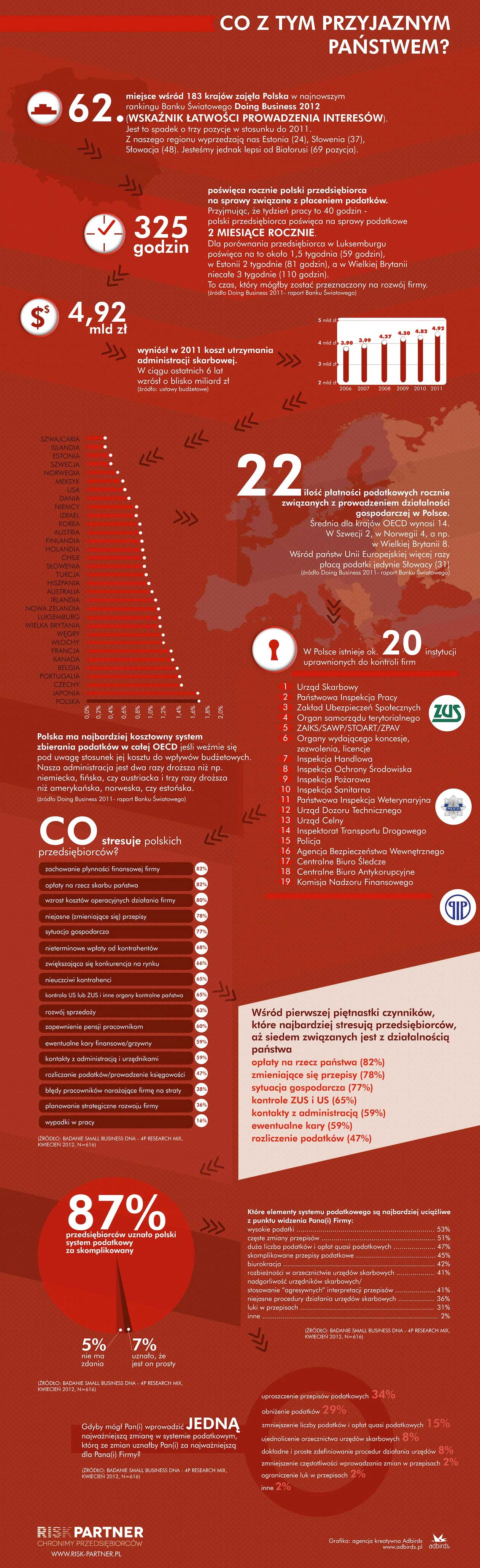 Wśród pierwszej piętnastki wprawiającej przedsiębiorców w poczucie stresu blisko połowa związana jest w mniejszym lub większym stopniu z działalnością̨ państwa – opłaty na rzecz państwa (82 proc.), zmieniające się przepisy (78 proc.), sytuacja gospodarcza (77 proc.), kontrole ZUS i US (65 proc.), kontakty z administracją (59 proc.), ewentualne kary (59 proc.), rozliczenie podatków (47 proc.)*.