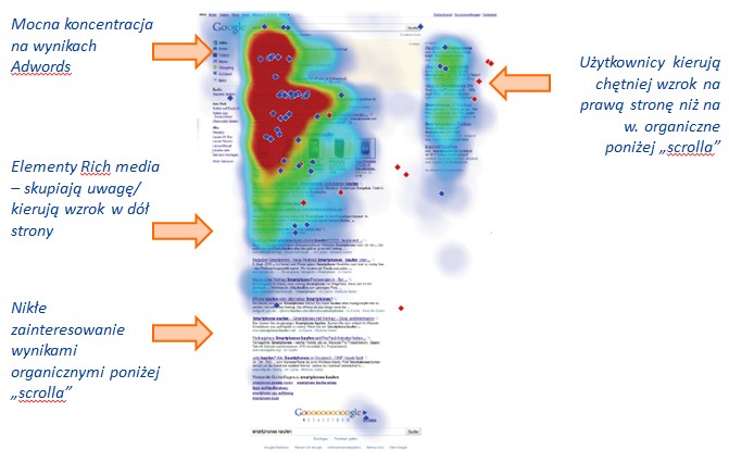 Jeśli spojrzymy, jak długo użytkownik koncentruje swój wzrok na poszczególnych obszarach, zauważymy nieznaczną przewagę wyników płatnych nad naturalnymi.