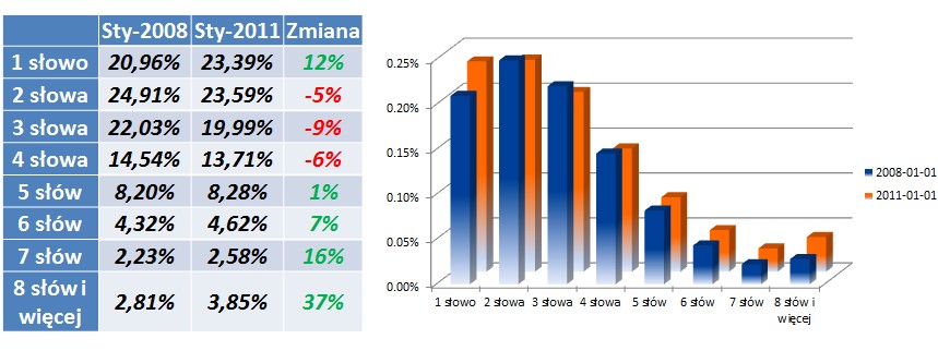Zachowania użytkowników zmieniają się również przy długości zapytań. Wzrasta liczba zapytań jedno- i wielowyrazowych, coraz więcej użytkowników wie czego szuka (nauczyło się szukać i definiować swoje potrzeby) oraz oczekuje precyzyjnych wyników wyszukiwania. Z pewnością istotną rolę odgrywają zapytania produktowe, wpisywane często z dokładną nazwą danego produktu.