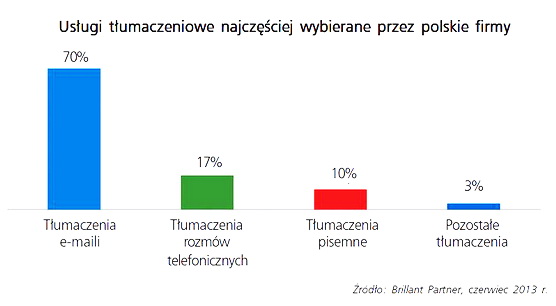 Z danych zebranych przez Brillant Partner wynika, że firmy chętnie korzystają z tych samych kanałów komunikacji, jeśli chodzi o kontakty z zagranicznymi kontrahentami. Najłatwiej jest nam wysłać e-maila i zlecić jego tłumaczenie (70 proc. zleceń tłumaczeń), coraz częściej też decydujemy się na tłumaczenie rozmów telefonicznych (17 proc. zapytań). Usługa teletłumaczeń jest już bardzo popularna na zachodzie i w USA, jednak polscy przedsiębiorcy przekonują się do niej powoli. W przeszłości mogło to wynikać z wysokich cen rozmów telefonicznych, jednak w dobie połączeń głosowych za pośrednictwem technologii VOIP, czynnik ten ma obecnie znaczenie drugoplanowe.
