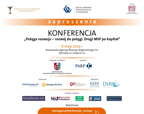 8 maja 2014 r. w Rzeszowie odbędzie się druga z cyklu konferencji nt. pozyskiwania przez firmy kapitału z wykorzystaniem rynków giełdowych. Na konferencję zapraszają Fundacja MSP, Giełda Papierów Wartościowych w Warszawie oraz Polskie Bractwo Kawalerów Gutenberga