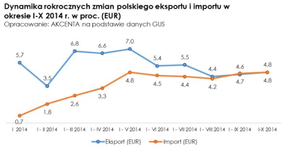 Choć w kontekście ograniczeń handlu ze Wschodem uwagę opinii publicznej przykuwają głównie wyniki polskiego eksportu, to zgodnie z danymi GUS w pierwszych dziesięciu miesiącach 2014 r. tempo wzrostu importu (4,8 proc. r/r) zrównało się z tempem polskiego eksportu (4,8 proc. r/r). Najszybciej rośnie import z Chin (17 proc. r/r).