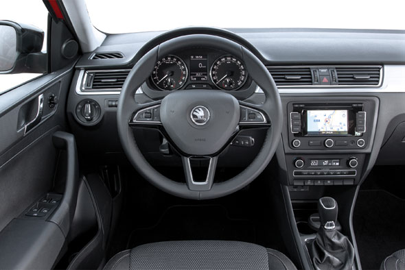 Wnętrze jest stonowane, bez zbędnych ozdób. Widać niemiecki charakter auta praktycznego, dlatego też Rapid świetnie zdaje egzamin jako auto firmowe. W wyposażeniu jest praktyczna wielofunkcyjna kierownica, dużo schowków, uporządkowana deska rozdzielcza, bez zbędnych ozdób w pokrętłach i przyciskach. W długich podróżach służbowych sprawdzą się sportowe, twarde fotele, które doskonale trzymają ciało i nie męczą kręgosłupa.