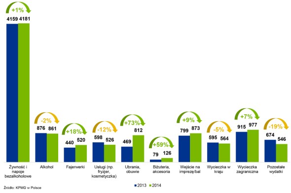 Jak wynika z raportu KPMG Polacy wydadzą na Święta Bożego Narodzenia 15,3 mld zł, co oznacza wzrost o 6 proc. w stosunku do 2013 r. Wydatki przeciętnego gospodarstwa domowego zwiększą się o około 50 zł i wyniosą 1031 zł. Najważniejszą kategorię wydatków będą stanowić tradycyjnie prezenty. Na podarunki dla najbliższych Polacy planują przeznaczyć blisko 6,5 mld zł, czyli 8 proc. więcej niż rok temu.