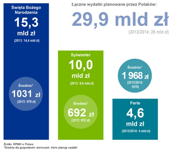 Jak wynika z czwartej edycji raportu KPMG, Polacy wydadzą w tym roku na Święta Bożego Narodzenia, Sylwestra i ferie zimowe łącznie 29,9 mld zł, co oznacza wzrost o blisko 7 proc. w porównaniu z zimą 2013/2014. Kwota przeznaczona na Święta wyniesie 15,3 mld zł, wydatki na Sylwestra pochłoną 10 mld zł, a na wyjazdy podczas ferii zimowych Polacy wydadzą 4,6 mld zł.
