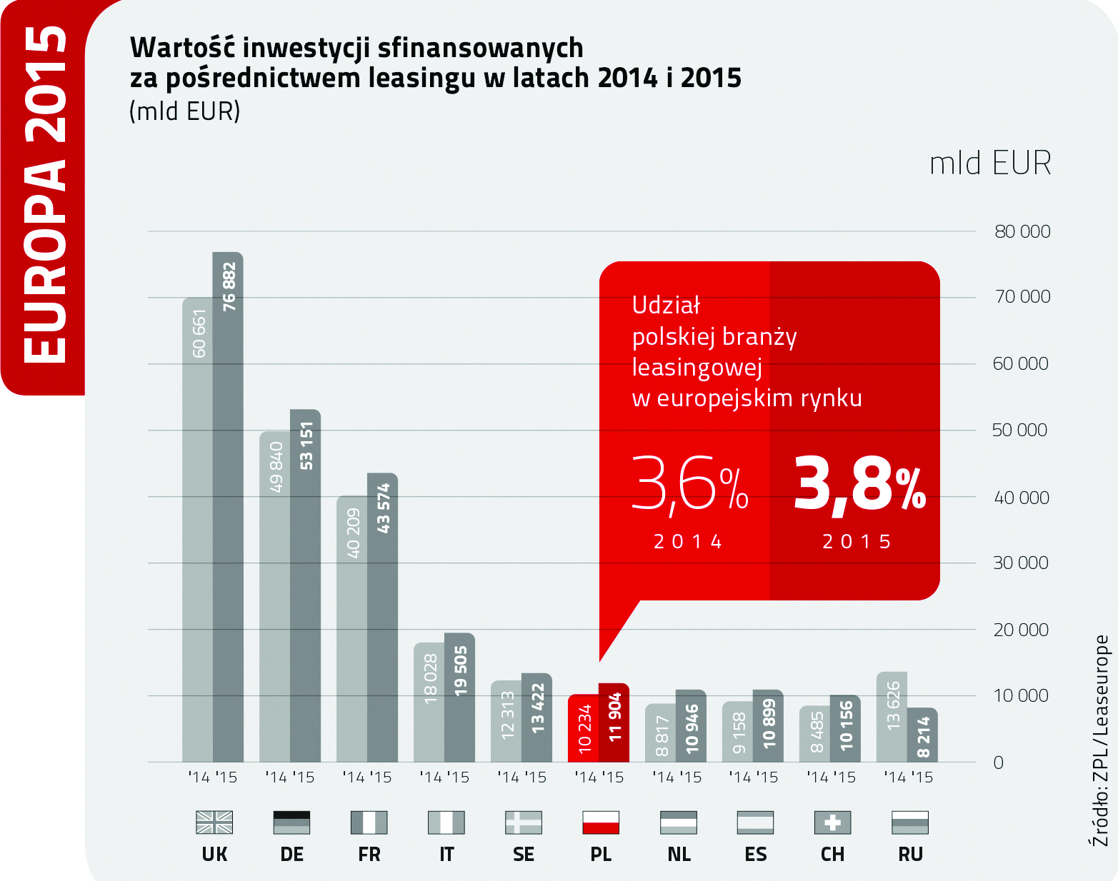 Polska jest jednym z sześciu najważniejszych rynków leasingu w Europie (pozostała piątka to Wielka Brytania, Niemcy, Francja, Włochy, Szwecja, Polska), wyróżniając się w tym gronie 16,3 proc. dynamiką(2). Udział polskiej branży leasingowej w europejskim rynku leasingu wynosi obecnie 3,8 proc. i systematycznie wzrasta. Awans polskiej branży leasingowej w europejskich rankingach wskazuje na wysoką popularność leasingu wśród polskich firm, głównie z sektora MSP oraz zaufanie, jakim firmy obdarzają branżę.