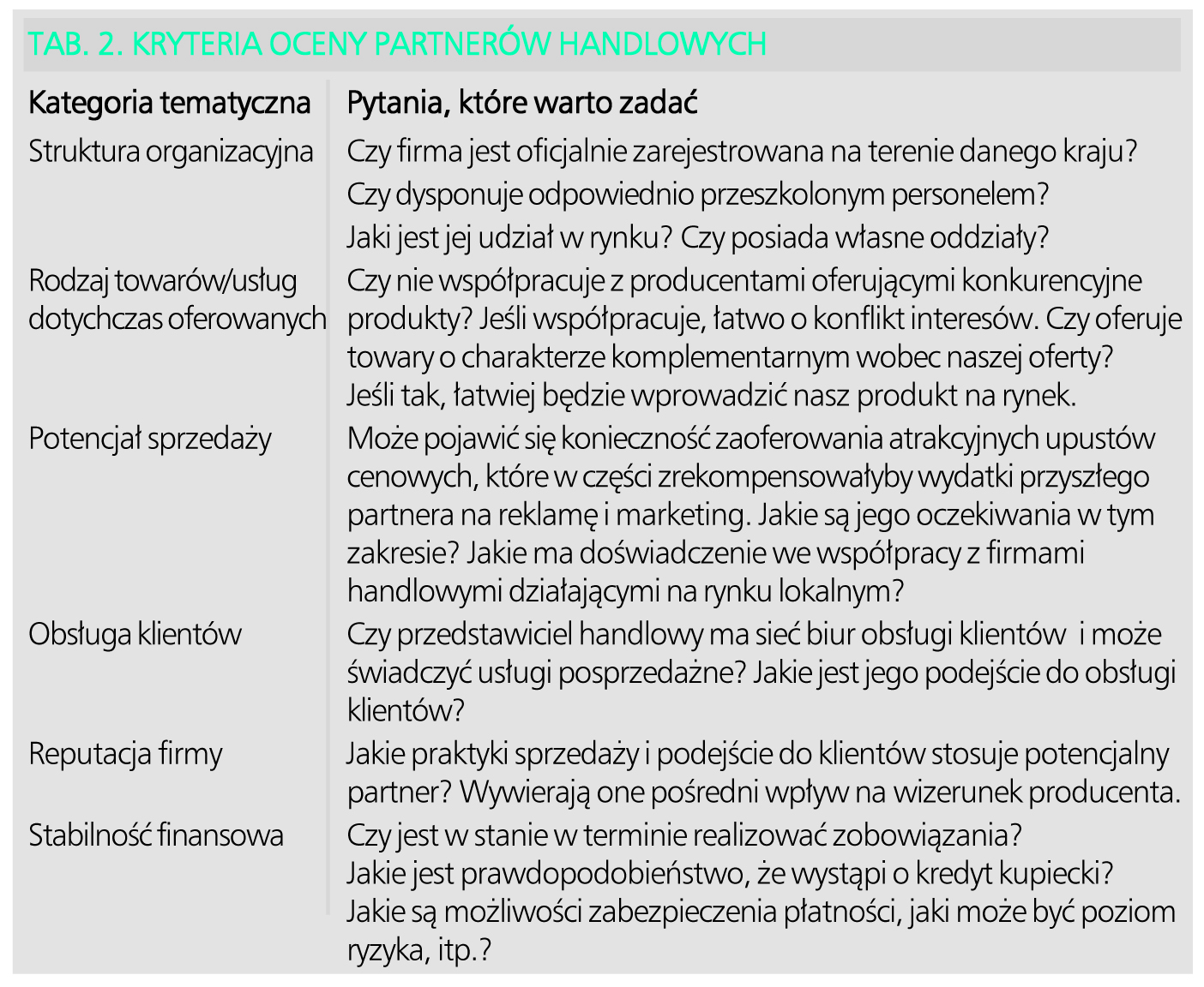 Oceny potencjalnych partnerów dokonuje się na podstawie pozyskanych informacji o ich działalności, strukturze, sytuacji finansowej, itp. Tabela 2. przedstawia przykładowy formularz oceny potencjalnych dystrybutorów. W przypadku pośredników i agentów handlowych najważniejsze są dane ogólne o firmie i jej wiarygodność.