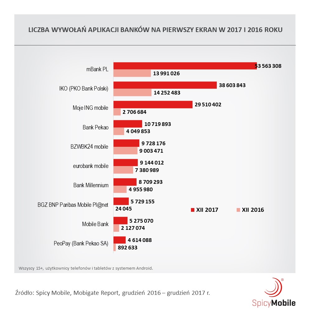 Co więcej, jak wynika z badania Spicy Mobile, rosną nie tylko zasięgi. Użytkownicy urządzeń mobilnych z roku na rok korzystają z aplikacji bankowych z dużo większą częstotliwością. Dla aplikacji BGZ BNP Paribas Mobile Pl@net liczba wywołań aplikacji na pierwszy ekran wzrosła nie kilka czy kilkanaście razy, ale kilkaset. Jedenastokrotny wzrost odnotowano z kolei w przypadku aplikacji Moje ING mobile. Najczęściej uruchamianą aplikacją była natomiast aplikacja mBank PL. W grudniu 2017 r. wywołano ją na pierwszy ekran blisko 53,6 mln razy.