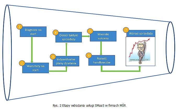 Zakres usługi SMaaS ustalany jest indywidualnie z przedsiębiorcą stosownie do potrzeb jego firmy. Zawsze jednak jej realizacja rozpoczyna się od etapu noszącego nazwę „Diagnoza na start’, w ramach którego oceniane są problemy i potrzeby firmy klienta oraz kompetencje handlowców. Na rys.2 schematycznie przedstawiano kolejne etapy we wdrażaniu usługi SMaaS.