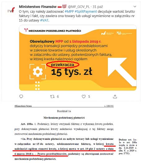Ostatni, obowiązujący od 1 listopada br. przypadek jest sprawą najgroźniejszą. Wydane przez Ministra wyjaśnienie, które wg wielu interpretacji nakłania do łamania prawa. Mowa o obowiązkowym split-paymencie, który zgodnie z niechlujnie uchwalonymi przepisami, odwołuje się do sytuacji, kiedy to „kwota należności ogółem stanowi kwotę, o której mowa w art. 19 pkt 2 ustawy z dnia 6 marca 2018 r. „Prawo przedsiębiorców”.