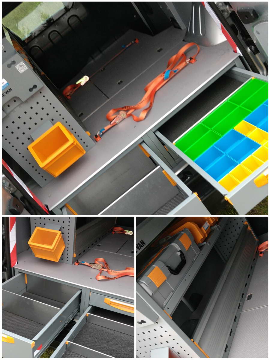 Podłoga auta została podniesiona, aby móc schować pod nią wysuwane gługie szuflady.