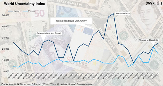W połowie roku wskaźnik WUI (wyk. 1.) dla Polski, po silnym wzroście wywołanym przez wybuch wojny w Ukrainie, nadal pozostaje na poziomach najwyższych od lat 80. ubiegłego wieku. Warto przypomnieć, że wówczas kluczowym problemem dla gospodarki również był gwałtowny wzrost cen, który utrzymywał się także przez kolejną dekadę.