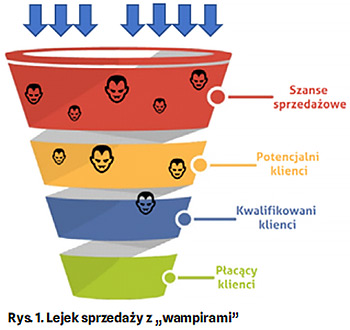 W rezultacie, w sprzedaży pojawiają się „czarne dziury”, ponieważ klienci, którzy mieli kupić, już kupili, a w lejku sprzedaży zostały „wampiry” (rys. 1), czyli potencjalni klienci, którzy angażując handlowców w kolejne rozmowy i działania, wysysają z nich najcenniejszy ich zasób: czas i energię. W rezultacie handlowcy są zajęci, ale nie sprzedają.