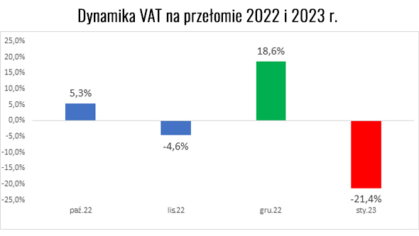 Kształtowanie się VAT na przełomie roku było dość zaskakujące. W grudniu 2022 r. po słabych wskaźnikach z października i listopada dane o VAT nagle skoczyły w górę (zanotowano wzrost aż o 18,6 proc. r/r), a potem – w styczniu nagle tąpnęły.