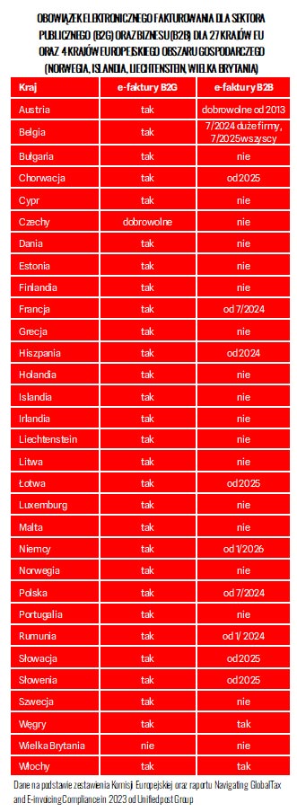 Komisja Europejska udzieliła Niemcom pozwolenia na rozpoczęcie stosowania dobrowolnego e-fakturowania B2B od stycznia 2025 r. Obowiązek, dotyczący firm z obrotem przekraczającym 800 tys. euro, wejdzie dopiero od 2027 r. We Francji e-faktury są dobrowolne, obowiązek zacznie być wprowadzany w latach 2024-2026, początkowo dla firm zatrudniających ponad 5 tys. pracowników i z rocznym przychodem ponad 1,5 mld euro. W Skandynawii e-fakturowanie B2B jest dobrowolne.
