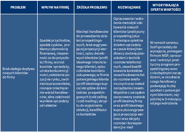 Znając źródła problemu wymienionego w kolumnie trzeciej, możemy sformułować naszą ofertę w kolumnie czwartej (Rozwiązanie), która będzie rozwiązywała większość problemów wymienionych w kolumnie 3 (Źródła problemu).
