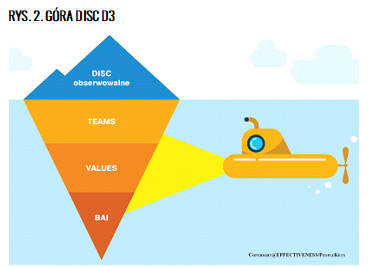 Wykorzystując metaforę góry lodowej (rys. 2.), test kompetencji DISC D3 bada nie tylko zachowanie danej osoby, które da się zaobserwować (DISC), ale też to, co jest poniżej poziomu wody, czego nie widać, a co wpływa na zachowania (preferowane role zespołowe TEAMS, wartości VALUES, wewnętrzne motywacje BAI).