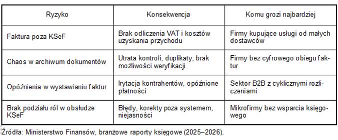 Brak kar ze strony urzędu skarbowego nie oznacza braku konsekwencji. Firmy, które nie wdrożyły KSeF lub zrobiły to chaotycznie, borykają się z problemami operacyjnymi, które bezpośrednio uderzają w finanse i relacje z kontrahentami. Najczęstsze ryzyka dotyczą odliczeń podatkowych, dezorganizacji dokumentów, opóźnień w rozliczeniach oraz braku jasnego podziału odpowiedzialności za obieg faktur. Poniższa tabela pokazuje najważniejsze zagrożenia wynikające z braku wdrożenia KSeF i ich konsekwencje dla firm: