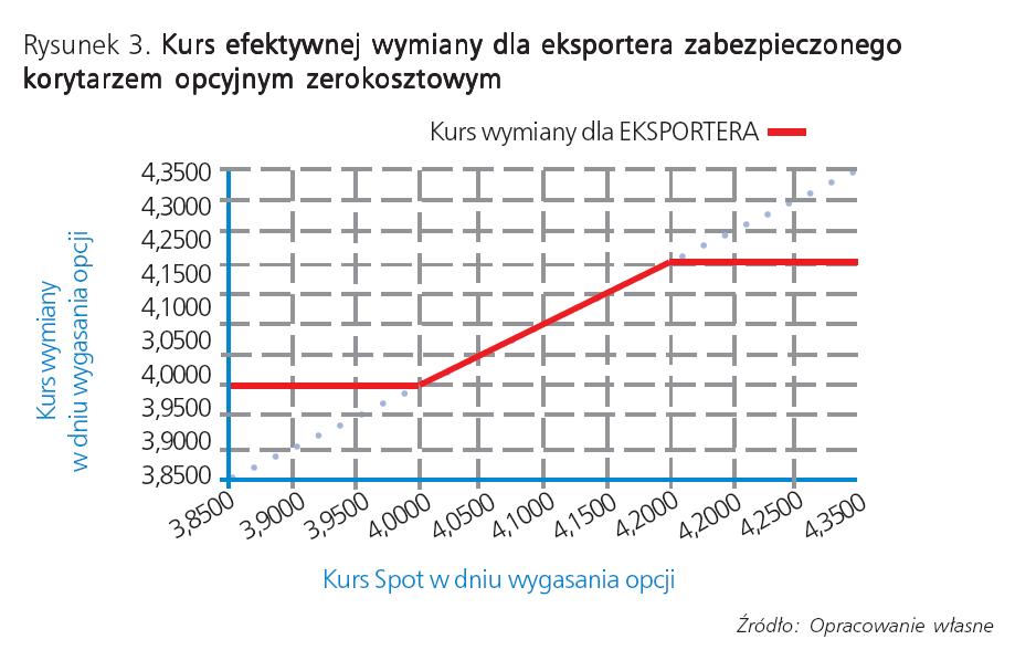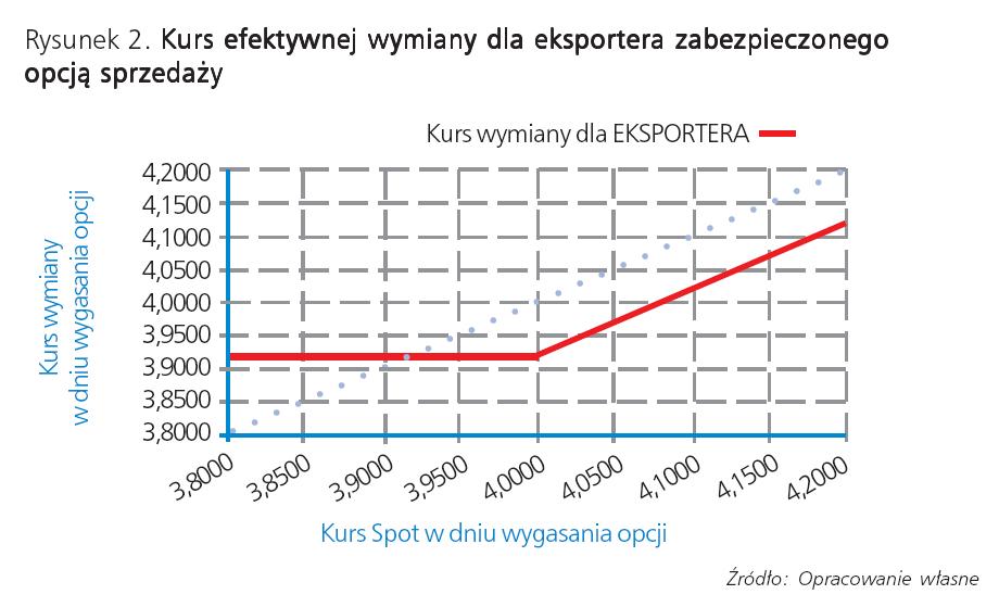 Jeśli kupiona opcja put uprawnia do sprzedaży 100 000 euro po kursie nie niższym niż kurs 4,00 EUR/PLN, i jeśli kurs za siedem miesięcy byłby niższy niż kurs wykonania opcji put, to eksporter sprzeda walutę po kursie 4,00 EUR/PLN, zaś po wliczeniu weń cen opcji efektywny kurs sprzedaży wyniesie 3,9150 EUR/PLN, gdyż koszt zakupu opcji wyniósł 8 500 zł. Zatem koszt zakupu pojedynczej opcji put jest uwzględniany w analizie jako ewentualna strata. Kupno opcji redukuje potencjalne straty do 22 000 zł (z których 8 500 zł stanowi premia płatna za opcję), zaś zawarcie transakcji typu korytarz – do 13 000 zł, gdyż w przypadku korytarza zerokosztowego koszt strategii wynosi zero.