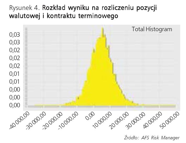 Kontrakt terminowy w zupełności eliminuje zmienność wartości pozycji walutowej, pod warunkiem że opiewa na identyczną kwotę i będzie rozliczony w tej samej dacie, w której nastąpi sprzedaż waluty obcej. Dla przykładu przyjrzymy się sytuacji, w której rozliczenie kontraktu terminowego nastąpi o tydzień wcześniej, np. z powodu opóźnienia płatności przez kontrahenta. Na rysunkach można porównać, jak ryzykowna jest pozycja niezabezpieczona oraz portfel składający się z pozycji walutowej i kontraktu terminowego rozliczanego na tydzień przed sprzedażą waluty. Na osiach poziomych należy znaleźć wartości możliwej straty. Na osiach pionowych z kolei odczytać, z jakim prawdopodobieństwem dana wielkość straty może wystąpić. Zabezpieczenie pozycji walutowej kontraktem terminowym – nawet takim, który nie jest rozliczany w identycznej dacie – najbardziej redukuje stopień możliwych strat finansowych. Aby dostrzec jak bardzo, wystarczy spojrzeć na rozpiętość wielkości strat na osi poziomej na obydwu rysunkach.