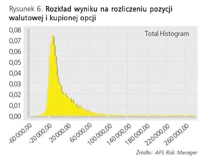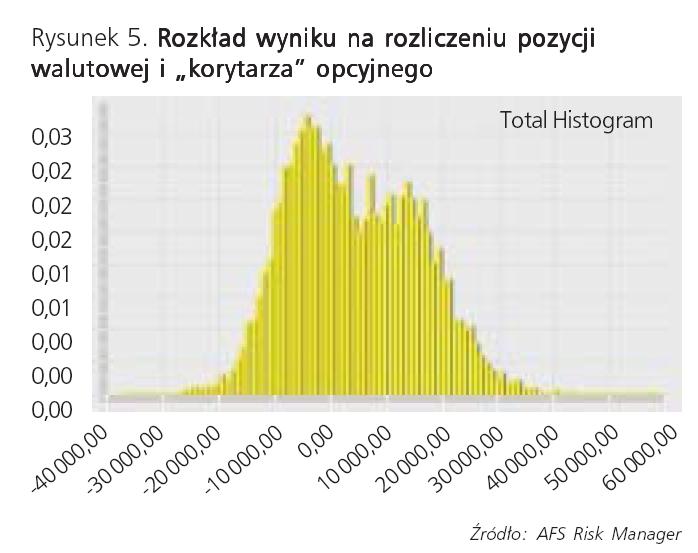 Bardziej interesujące staje się porównanie efektów trzech zabezpieczeń. Kontrakt terminowy najskuteczniej redukuje ewentualne straty – w naszym przykładzie z 63 000 zł do 8 500 zł. Zawarcie kontraktu terminowego nie wymaga płatności, zatem jednocześnie redukuje prawdopodobieństwo uzyskania pozytywnego wyniku na rozliczeniu transakcji pochodnej i sprzedaży waluty do minimum. Jeśli przedsiębiorca chce mieć możliwość poprawy wyniku na rozliczeniu, musi zdecydować się na kupno opcji lub zawarcie korytarza opcyjnego zerokosztowego (kupno i sprzedaż opcji o tak dobranych kursach wykonania, aby nie było konieczne zapłacenie premii).